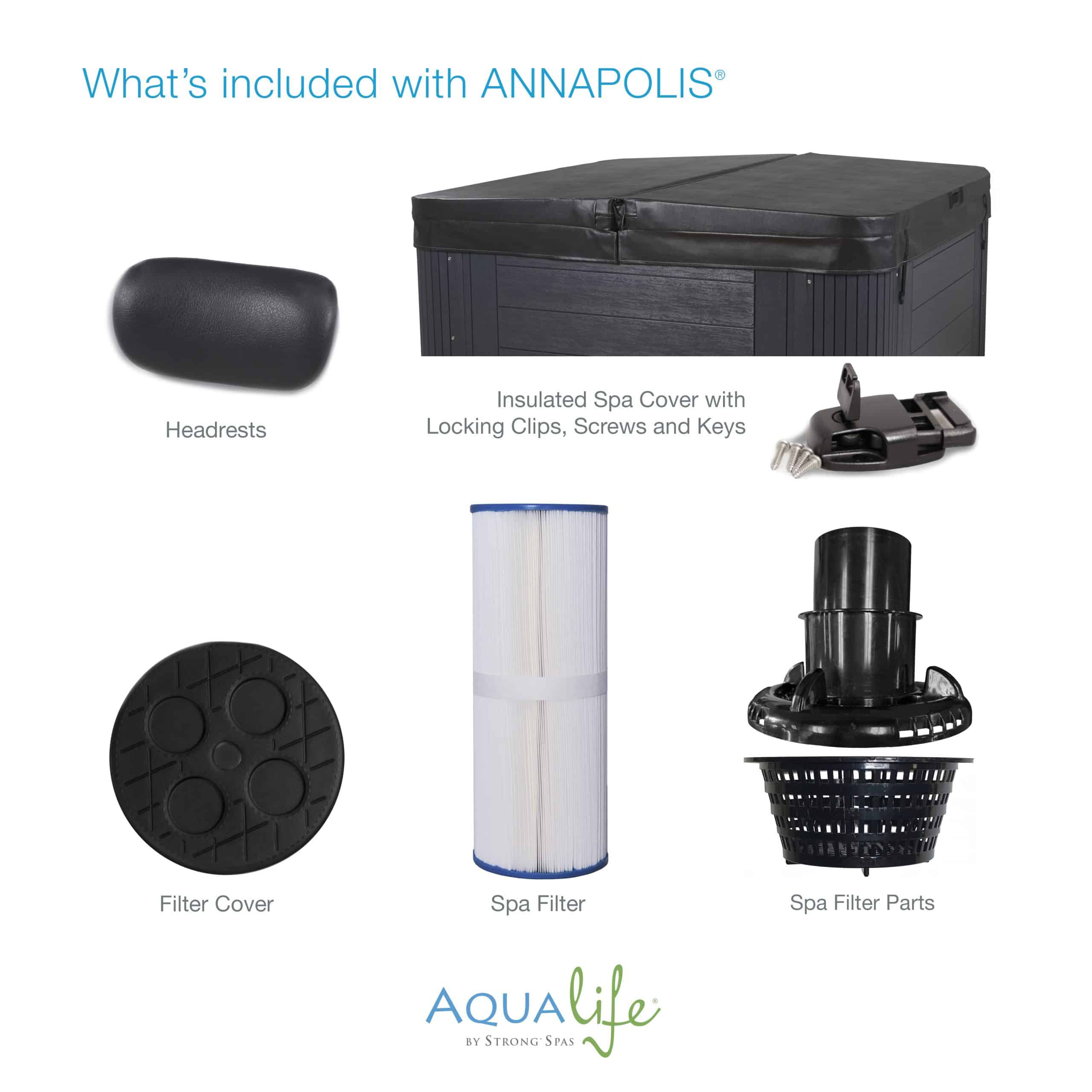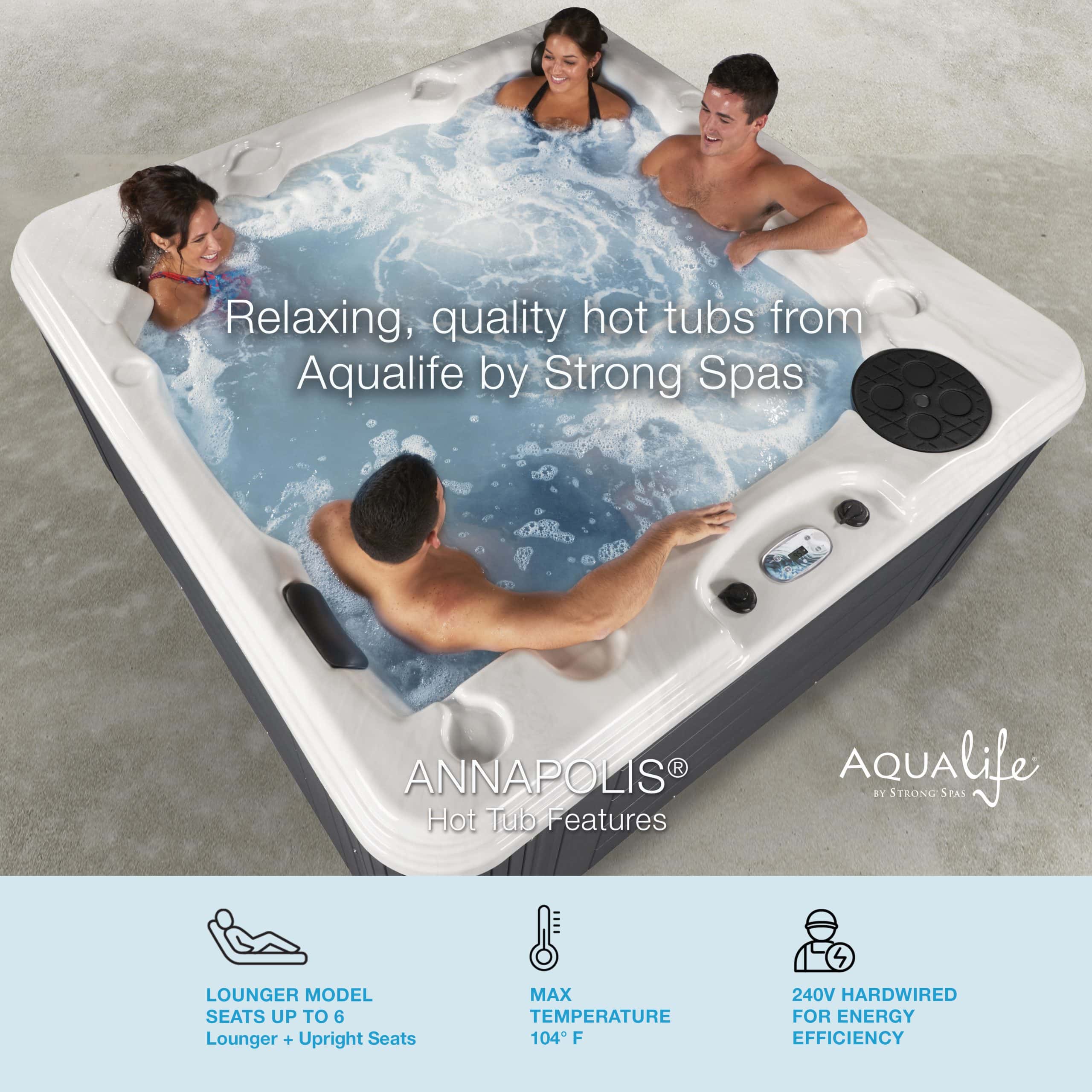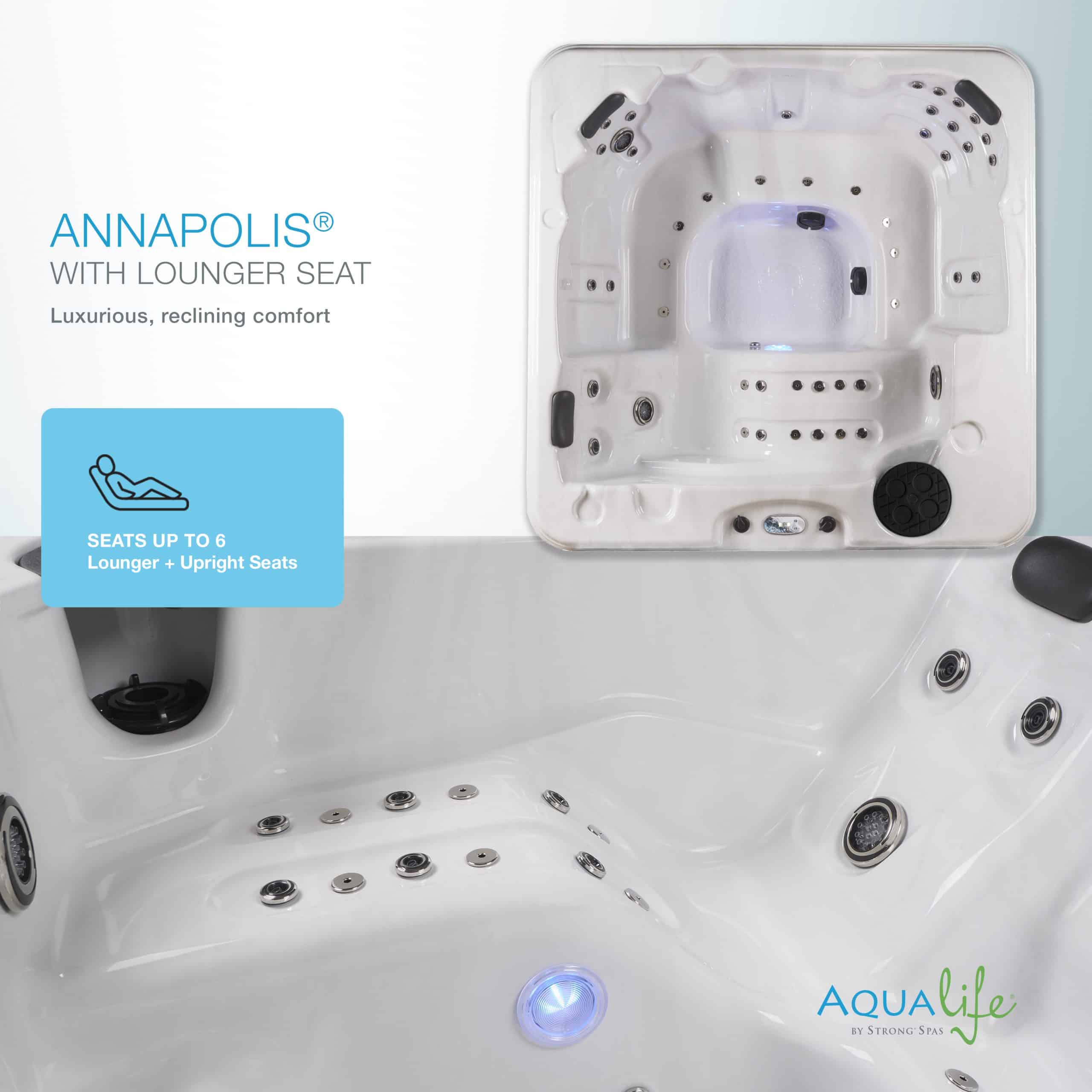 The Annapolis® Spa by Aqualife Spas from Strong Spas is a well-appointed hot tub designed to transform your daily life with luxurious hydrotherapy. Experience the soothing power of 89 hydrotherapy streams delivered through 50 stainless steel jets, specifically targeting areas where you need relief the most. The spa accommodates up to 6 people, featuring a contoured lounger that cradles you from head to toe, complemented by comfortable headrests. Our carefully engineered design ensures optimal and effective water pressure through every jet, providing a deep tissue massage that revitalizes your body and mind. The Annapolis Spa is powered by an energy-efficient 5BHP 2-speed pump and a 1HP blower, delivering powerful yet comfortable hydrotherapy. The 4kW stainless steel heater maintains your ideal water temperature, making any time the perfect time for a spa session.