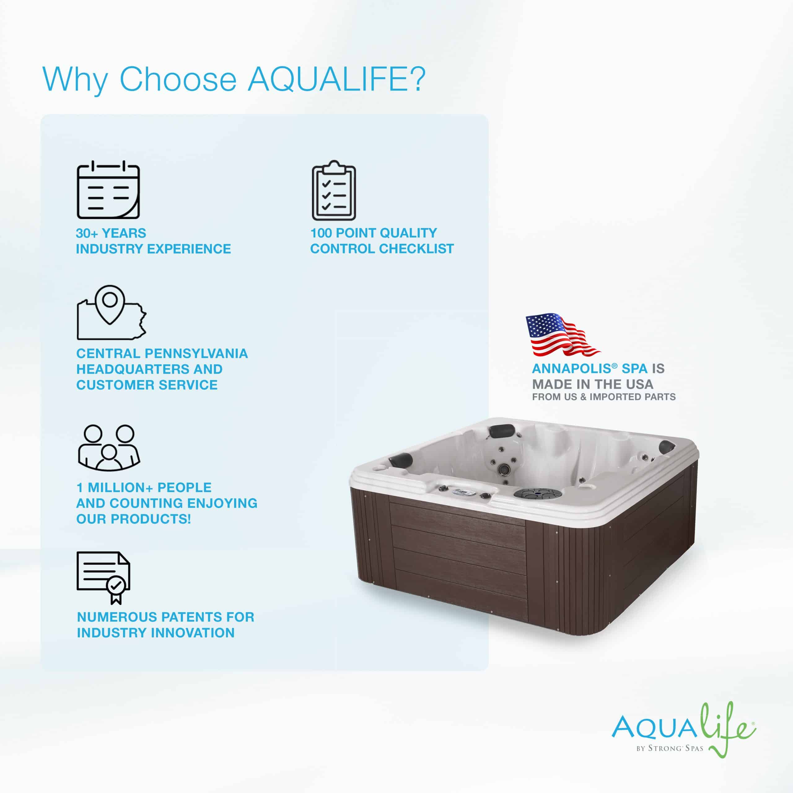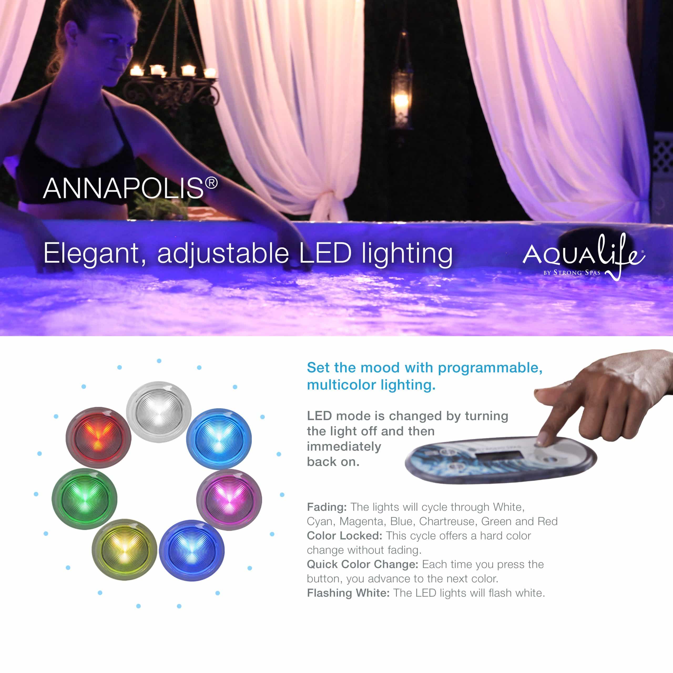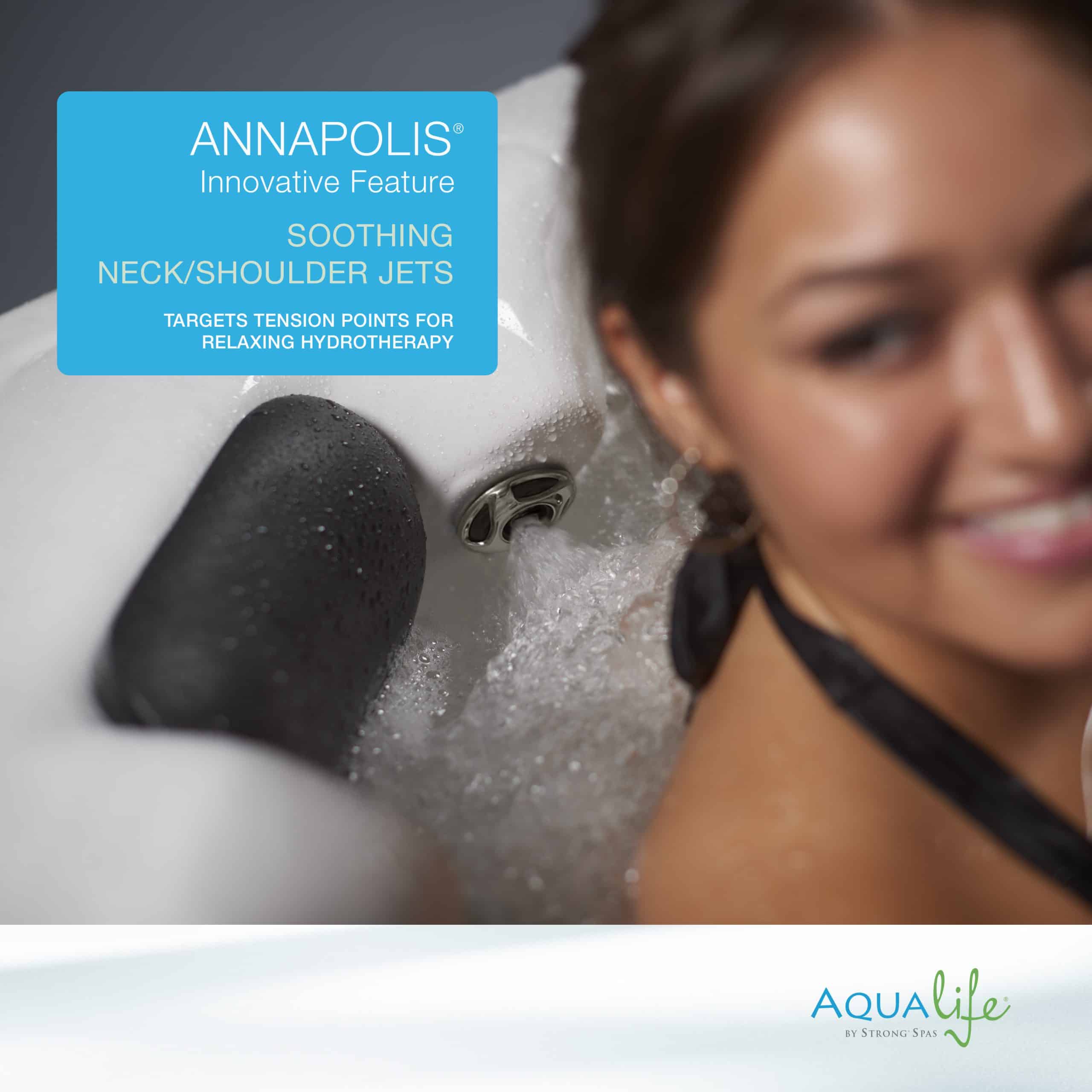 The Annapolis® Spa by Aqualife Spas from Strong Spas is a well-appointed hot tub designed to transform your daily life with luxurious hydrotherapy. Experience the soothing power of 89 hydrotherapy streams delivered through 50 stainless steel jets, specifically targeting areas where you need relief the most. The spa accommodates up to 6 people, featuring a contoured lounger that cradles you from head to toe, complemented by comfortable headrests. Our carefully engineered design ensures optimal and effective water pressure through every jet, providing a deep tissue massage that revitalizes your body and mind. The Annapolis Spa is powered by an energy-efficient 5BHP 2-speed pump and a 1HP blower, delivering powerful yet comfortable hydrotherapy. The 4kW stainless steel heater maintains your ideal water temperature, making any time the perfect time for a spa session.